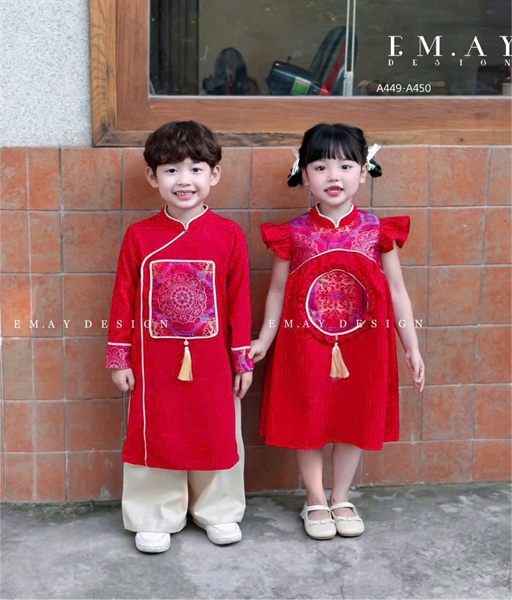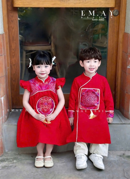 Bộ áo dài cách tân bé trai – bé gái đỏ họa tiết thêu