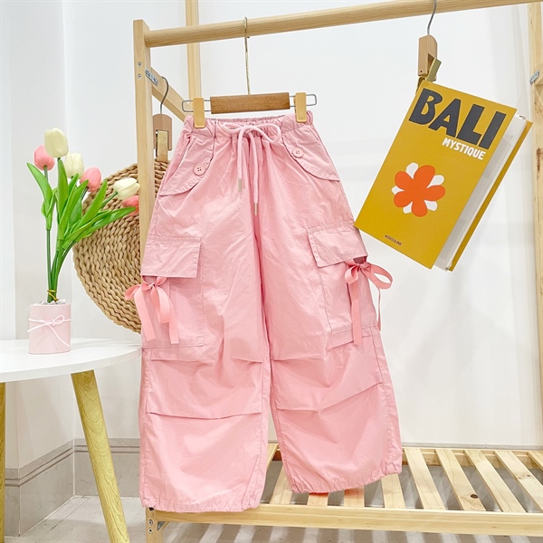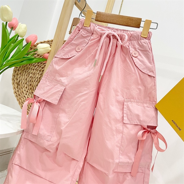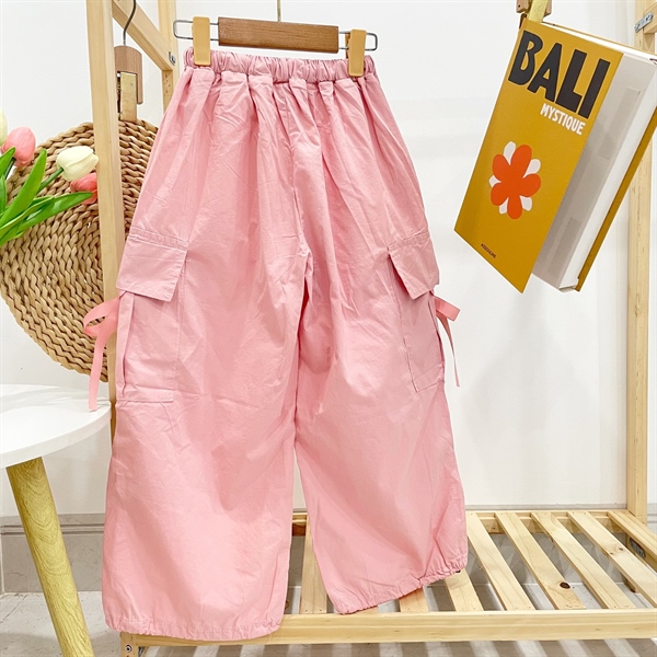 Quần ống rộng màu hồng phấn, có chi tiết rút dây hai bên → tạo điểm nhấn lạ mắt, rất hợp style streetwear.