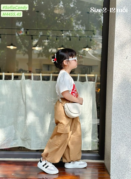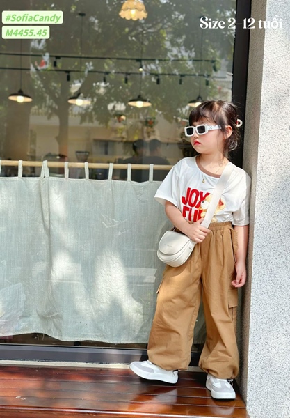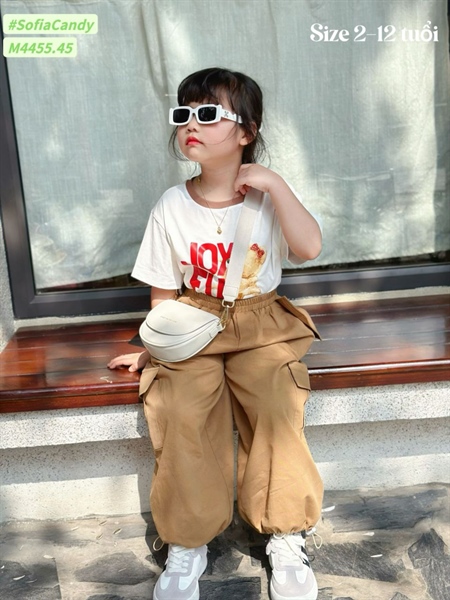 Set bộ bé gái tay ngắn quần dài M4455 . Gồm Áo Gấu mix quần kaki dài có thể mặc thành ống suông or rút lại là quần jogger .