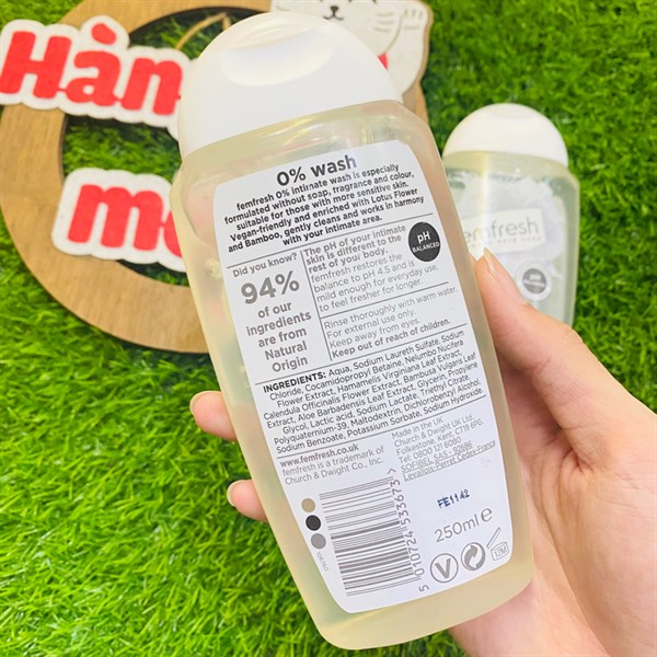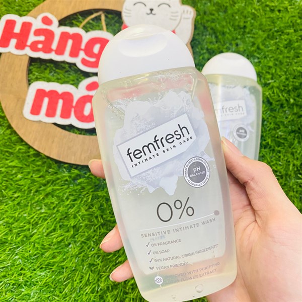 Dung dịch vệ sinh phụ nữ cao cấp cho da nhạy cảm Femfresh 0% Sensitive Wash 250ml thích hợp sử dụng hàng ngày cho chị em phụ nữ mọi độ tuổi, đặc biệt phù hợp với những người có làn da nhạy cảm. Đây là sản phẩm thuần chay với 94% thành phần gốc thiên nhiên: chiết xuất hoa sen tinh khiết, tinh chất lá cây phỉ, tinh chất lô hội,… giúp làm sạch vùng kín nhẹ nhàng, tinh tế tạo cảm giác dễ chịu, sạch sẽ, thoáng mát suốt 24h cho cảm giác tươi mát cả ngày.