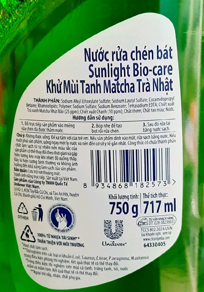Nước rửa chén Sunlight 725ml (khử mùi tanh MatCha trà nhật) - chai