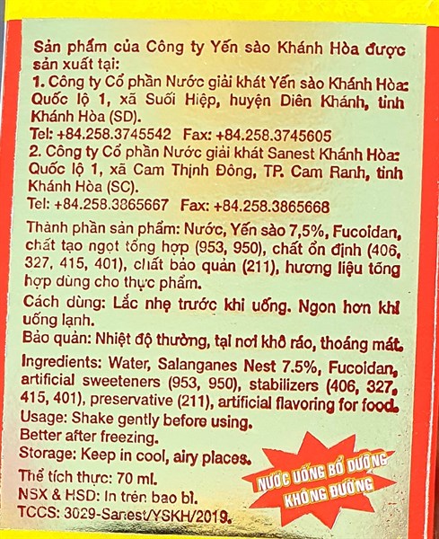Nước Yến sào Khánh Hòa Sanest không đường ( lọ 70 ml) - lọ