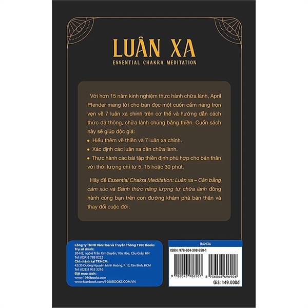 Thiền là loại hình rèn luyện mang tới vô số ích lợi cho người thực hành, giúp nâng cao cả sức khỏe thể chất và sức khỏe tinh thần. Chắc hẳn ai cũng từng nghe tới thiền, nhưng không phải người nào cũng biết cách thiền thế nào để đạt được hiệu quả mong muốn. Nắm bắt được nhu cầu thực hành thiền định ngày một gia tăng, April Pfender đã mang tới cho bạn đọc cuốn sách Essential Chakra Meditation: Luân xa – Cân bằng cảm xúc và Đánh thức năng lượng tự chữa lành.