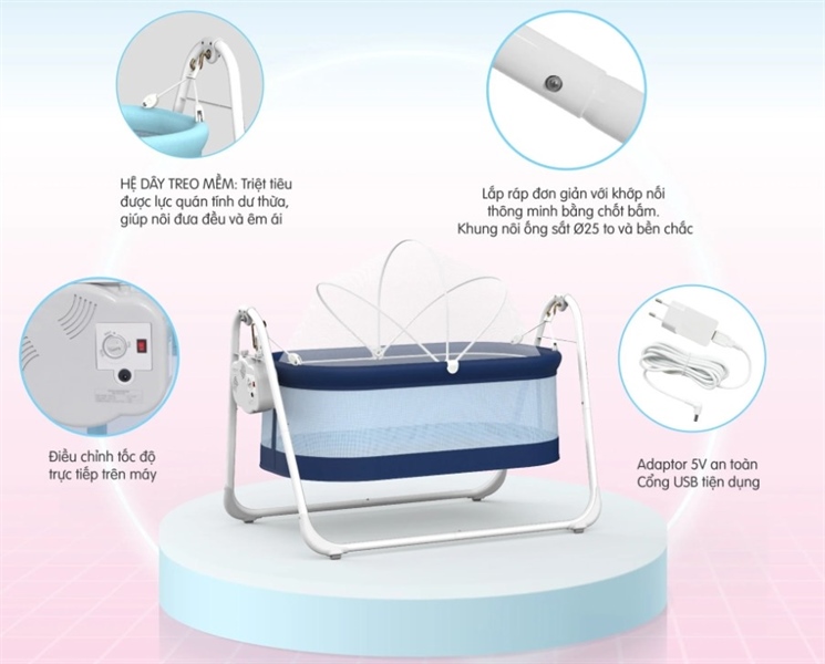 - Cắm điện, kiểm tra nguồn điện và bật công tác máy đưa, đảm bảo nôi hoạt động bình thường.