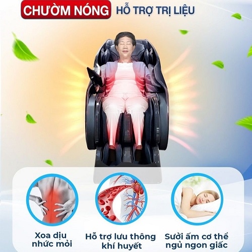 Nhiệu sưởi ấm truyền năng lượng thông qua các sợi carbon, cung cấp nhiệt ấm đẩy lùi hàn khí, thẩm thấu vào từng tế bào, đem tới cảm giác thư giãn sâu tầng, dễ chịu, thư thái từ sâu bên trong cơ thể. Nhiệt nóng kết hợp với các bài tập massage giúp hiệu quả nhân đôi, hỗ trợ xoa dịu nhức mỏi, kích thích lưu thông khí huyết, giảm cảm giác căng thẳng, lo âu từ đó người dùng dễ dàng chìm sâu vào giấc ngủ, ngủ ngon và sâu giấc hơn.
