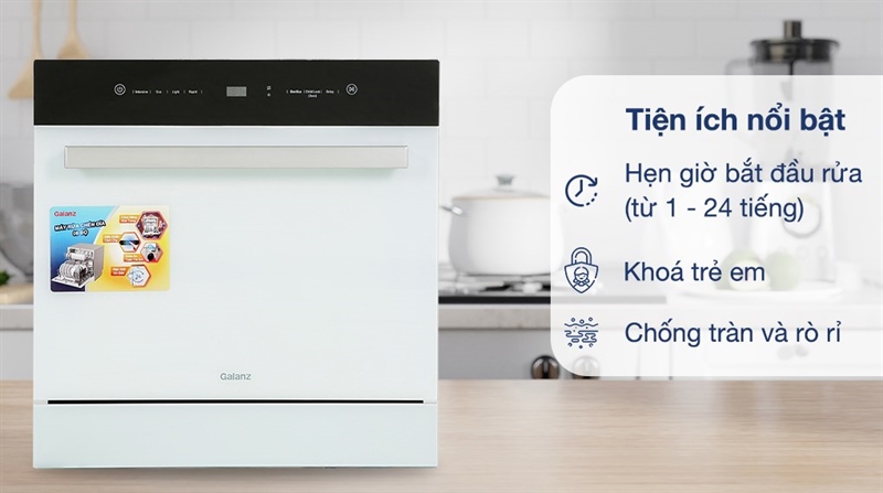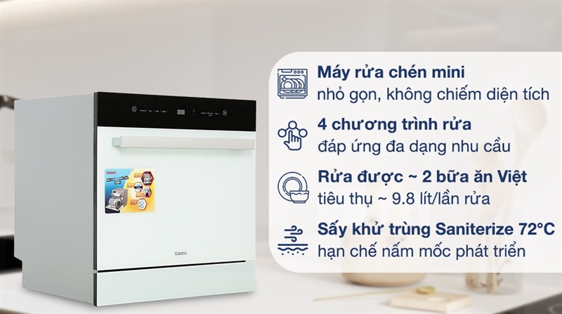 Được thiết kế khá nhỏ gọn có thể đặt để ở bất kỳ không gian bếp mà không chiếm quá nhiều diện tích, máy rửa chén mini Galanz W8A2Q1-0E1(W) còn tích hợp công nghệ sấy khử trùng Saniterize 72°C an toàn cho sức khỏe và 4 chương trình rửa đáp ứng cho nhiều nhu cầu khác nhau.
