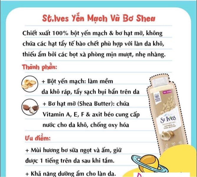 Là dòng duy nhất không có chứa hạt scrub tẩy tế bào chết, toàn bộ tinh hoa của St.Ives Oat-meat & Shea Butter tập trung vào khả năng dưỡng ẩm của sản phẩm. Mùi thơm ngọt và ấm. Tựa mùi của Vanila. Rất hợp với những bạn có da khô vào mùa đông nhé