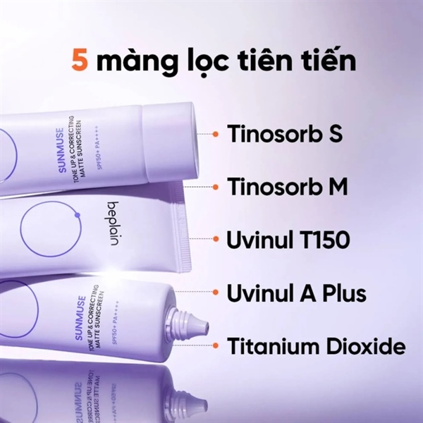 - Chống nắng tốt nhờ 5 màng lọc phổ rộng: màng lọc hóa học (Tinasorb S, Uvinul T150, Uvinul A Plus) màng lọc vật lý (Titaniumm Dioxide, Tinasorb M)