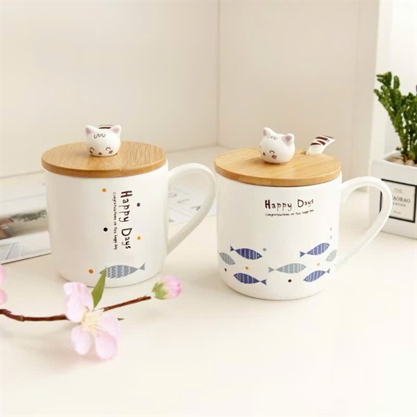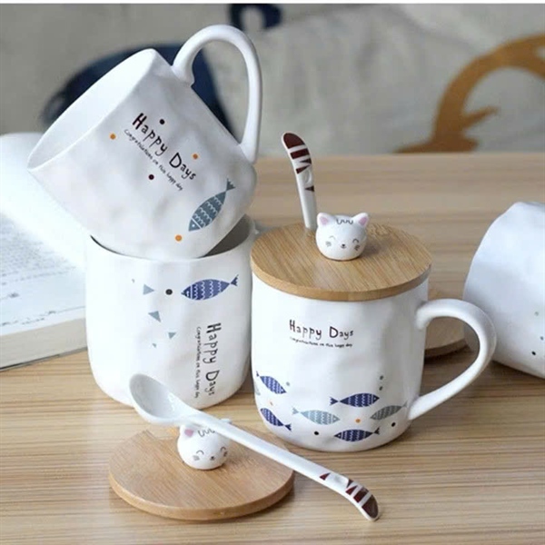Cốc sứ Cá nắp Mèo gỗ kèm thìa 400ml mẫu mới