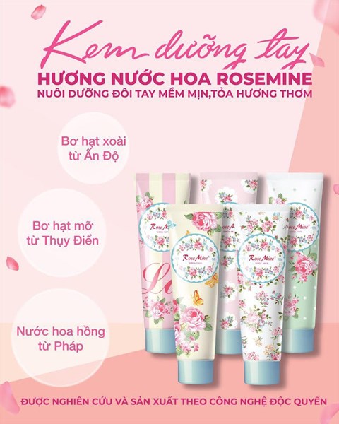 Kem dưỡng da tay Rose Mine mềm, mượt, thẩm thấu nhanh, không màu, không gây bết dính khó chịu trên da, hương thơm sang trọng, thanh lịch và bền lâu,có thành phần hương nước hoa đậm đặc.