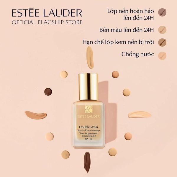 Nằm trong dòng trang điểm Double Wear trứ danh với khả năng che phủ rất tốt các khuyết điểm trên da bao gồm các đường nhăn, nếp nhăn, phần da không đều màu, tạo ra lớp nền hoàn hảo nhưng vẫn tự nhiên.