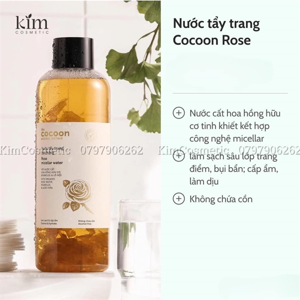 𝐍𝐮̛𝐨̛́𝐜 𝐓𝐚̂̉𝐲 𝐓𝐫𝐚𝐧𝐠 𝐇𝐨𝐚 𝐇𝐨̂̀𝐧𝐠 𝐂𝐨𝐜𝐨𝐨𝐧~ Dung tích : 500ml____________________Với nước cất hoa hồng hữu cơ tinh khiết kết hợp với công nghệ Micellar, nước tẩy trang hoa hồng giúp làm sạch sâu lớp trang điểm, bụi bẩn, cấp ẩm và làm dịu, mang lại làn da sạch và mịn màngThành phần chính nước tẩy trang hoa hồng cocon:- Nước cất hoa hồng hữu cơ (hydrosol): Nước hoa hồng có tính năng làm se, làm mềm và chống oxy hóa cho làn da.- Bisabolol: Hoạt chất dạng dầu có trong Cúc La Mã giúp làm dịu da, giảm ửng đỏ, kháng viêm, chống kích ứng cho da nhạy cảm.