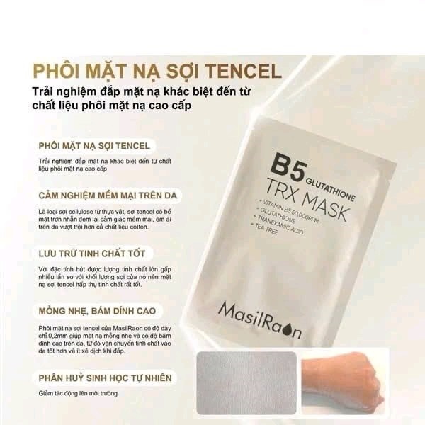 🍀 Điểm nổi bật của mặt nạ MasilRaon B5 Glutathione TRX Mask nằm ở tỷ lệ cao thành phần hoạt chất và nguyên liệu phôi mặt nạ từ sợi tencel cao cấp.