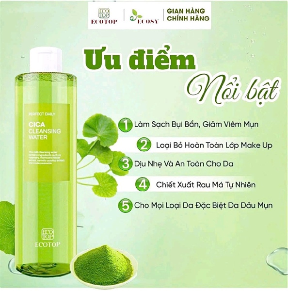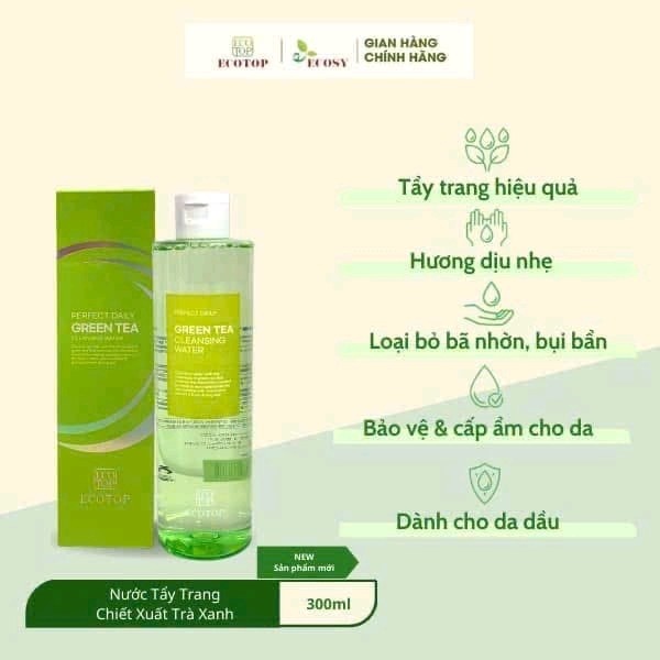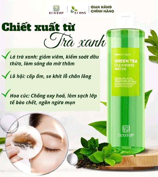 🍃 Làm sạch hiệu quả, dưỡng da hoàn hảo – Nước tẩy trang ECOTOP chiết xuất trà xanh là giải pháp tuyệt vời giúp bạn làm sạch lớp trang điểm, bụi bẩn và dầu thừ