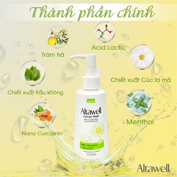 Bộ ba thành phần nổi bật: chiết xuất cúc la mã, tràm trà và Acid Lactic được biết đến với hiệu quả nổi bật trong khả năng kháng viêm, giữ ẩm và nhẹ nhàng làm sạch giúp bạn tự tin thoải mái mỗi ngày. Sản phẩm gel dung dịch vệ sinh Altawell với công dụng chính: