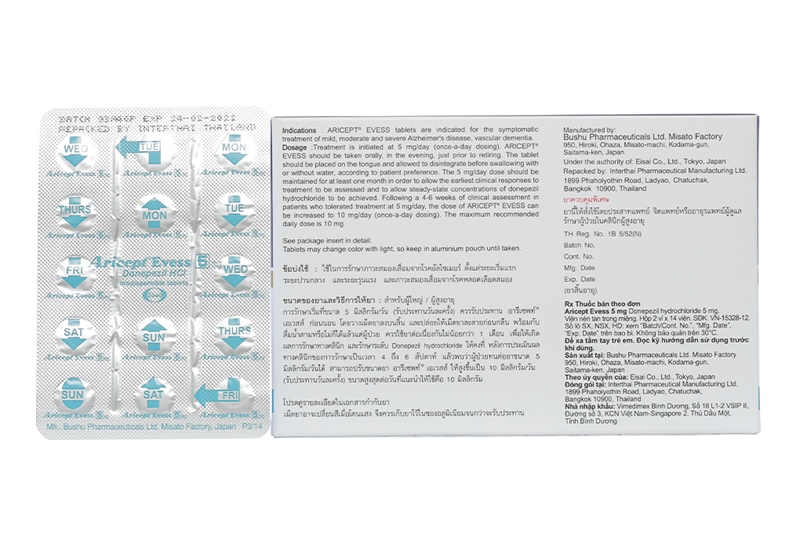 Aricept Evess có thành phần chính là donepezil hydrochloride, dùng trong điều trị triệu chứng của bệnh Alzheimer và chứng sa sút trí tuệ trong bệnh mạch máu não. Để đảm bảo hiệu quả điều trị và tránh được tác dụng phụ không mong muốn, người bệnh cần tuân theo đúng chỉ dẫn của bác sĩ, dược sĩ chuyên môn.