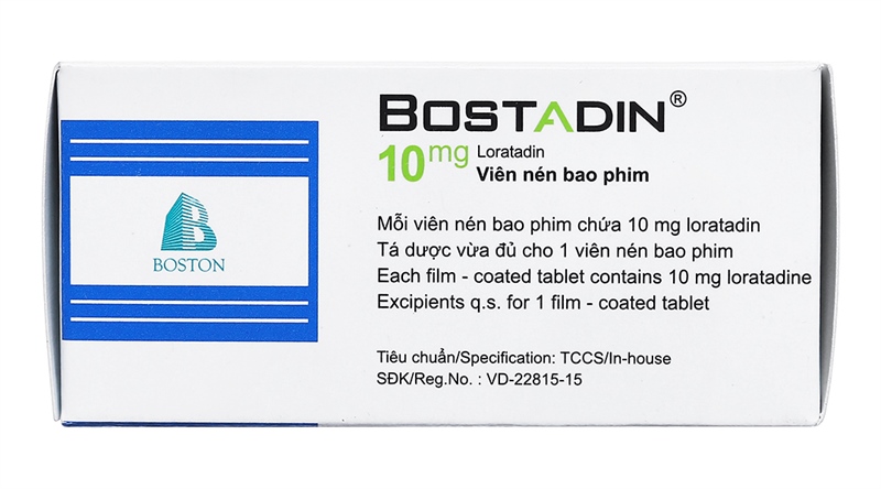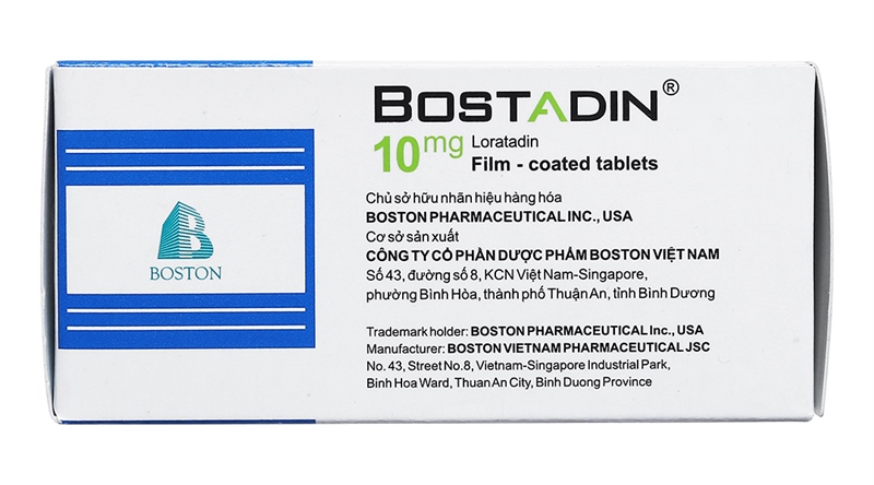 1. Thành phầnMỗi viên nén bao phim chứa:- Hoạt chất: Loratadin 10 mg- Tá dược: Lactose monohydrat, avicel PH 101, natri croscarmellose, maltodextrin, povidon K30, magnesi stearat, aerosil, HPMC 615, HPMC 606, PEG 6000, titan dioxyd vừa đủ 1 viên nén bao phim.2. Công dụng (Chỉ định)- Viêm mũi dị ứng.- Viêm kết mạc dị ứng.- Ngứa và mày đay liên quan đến histamin.3. Cách dùng - Liều dùngCách dùng: BOSTADIN được dùng bằng đường uống, không cần chú ý đến bữa ăn. Đối với trẻ nhỏ từ 2 đến 5 tuổi nên uống với nhiều nước.Liều dùng:- Người lớn, người cao tuổi và trẻ em > 12 tuổi: 1 viên mỗi ngày.- Trẻ em 2-12 tuổi:- Trẻ từ 2 - 5 tuổi: 5mg/ngày (1/2 viên/ngày).- Trẻ từ 6 - 12 tuổi: 1 viên/ngày.- An toàn và hiệu quả khi dùng Loratadin cho trẻ em dưới 2 tuổi chưa được xác định.Bệnh nhân suy gan hoặc suy thận (độ thanh thải creatinin < 30 ml/phút):- Người lớn và trẻ em từ 6 tuổi: khởi đầu là 1 viên, cứ hai ngày một lần.- Trẻ em từ 2-5 tuổi: 5mg (1/2 viên), hai ngày một lần.- Quá liều- Triệu chứng: ở người lớn, sau khi uống quá liều loratadin (40 -180 mg) thì có những biểu hiện: buồn ngủ, nhịp tim nhanh và đau đầu, trẻ em, có biểu hiện ngoại tháp và đánh trống ngực.- Điều trị: Điều trị quá liều loratadin thường là điều trị triệu chứng và hỗ trợ, bắt đầu ngay và duy trì chừng nào còn cần thiết. Trong trường hợp quá liều cấp, gây nôn bằng sữa ipeca để làm sạch dạ dày ngay. Dùng than hoạt sau khi gây nôn có thể giúp ích để ngăn ngừa hấp thu loratadin. Nếu gây nôn không hiệu quả hoặc bị chống chỉ định (thí dụ đối với bệnh nhân bị ngất, co giật, hoặc thiếu phản xạ nôn), có thể tiến hành rửa dạ dày với dung dịch natri clorid 0,9% và đặt ống nội khí quản để phòng ngừa hít phải dịch dạ dày.4. Chống chỉ địnhQuá mẫn với loratadin hoặc bất kỳ thành phần nào của thuốc.5. Tác dụng phụ- Thường gặp: đau đầu, khô miệng.- Ít gặp: chóng mặt, khô mũi và hắt hơi, viêm kết mạc.- Hiếm gặp: trầm cảm, tim đập nhanh, loạn nhịp nhanh trên thất, đánh trống ngực. Buồn nôn, chức năng gan bất bình thường, kinh nguyệt không đều. Ngoại ban, nổi mày đay, choáng phản vệ.Thông báo cho bác sĩ những tác dụng không mong muốn gặp phải khi sử dụng thuốc6. Lưu ý- Thận trọng khi sử dụng- Bệnh nhân suy gan.- Khi dùng loratadin, có nguy cơ khô miệng, đặc biệt ở người cao tuổi, và tăng nguy cơ sâu răng. Do đó phải vệ sinh răng miệng khi dùng thuốc.- Thận trọng khi dùng thuốc cho phụ nữ có thai và cho con bú.Không dùng thuốc khi quá hạn sử dụng.- Thai kỳ và cho con bú- Phụ nữ có thai: Do chưa có các nghiên cứu đầy đủ và có kiểm soát về việc dùng loratadin cho phụ nữ có thai. Chỉ dùng với liều thấp và trong thời gian ngắn, khi lợi ích trị liệu cho người mẹ lớn hơn nguy cơ có hại cho thai nhi.- Phụ nữ cho con bú: Loratadin và chất chuyển hóa descarboethoxyloratadin phân bổ trong sữa mẹ. Cần thận trọng khi dùng loratadin ở phụ nữ đang cho con bú và quyết định về việc ngưng dùng thuốc phụ thuộc vào tầm quan trọng của thuốc đối với người mẹ. Nếu cần chỉ nên dùng thuốc với liều thấp và trong thời gian ngắn.- Khả năng lái xe và vận hành máy mócThận trọng dùng thuốc khi đang lái xe hoặc thực hiện các công việc đòi hỏi sự tỉnh táo.- Tương tác thuốc- Điều trị đồng thời loratadin và cimetidin dẫn đến tăng nồng độ loratadin trong huyết tương 60%.- Điều trị đồng thời loratadin và ketoconazol dẫn tới tăng nồng độ loratadin trong huyết tương gấp 3 lần.- Điều trị đồng thời loratadin và erythromycin dẫn đến tăng nồng độ loratadin trong huyết tương.7. Dược lý- Dược động học (Tác động của cơ thể với thuốc)- Sau khi uống, loratadin được hấp thu nhanh, nồng độ đỉnh trong huyết tương của loratadin và chất chuyển hóa có hoạt tính của nó (descarboethoxyloratadin) tương ứng với 1,5 và 3,7 giờ.- Loratadin gắn kết với protein huyết tương khoảng 97%. Thời gian bán thải của loratadin là 17 giờ, descarboethoxyloratadin là 19 giờ. Thời gian bán thải của thuốc biến đổi nhiều giữa các cá thể, không bị ảnh hưởng bởi ure máu, tăng lên ở người cao tuổi và người xơ gan.- Độ thanh thải của thuốc là 57-142 ml/phút/kg và không bị ảnh hưởng bởi urê máu nhưng giảm ở người bệnh xơ gan. Thể tích phân bố của thuốc là 80 -120 lít/kg.- Loratadin chuyển hóa nhiều qua gan lần đầu bởi hệ enzym microsom cytochrom P450 chủ yếu chuyển hóa thành descarboethoxyloratadin, là chất chuyển hóa có tác dụng dược lý.- Khoảng 80% liều dùng được thải trừ vào nước tiểu và phân với tỉ lệ ngang nhau, dưới dạng chất chuyển hóa, trong vòng 10 ngày.- Sau khi uống loratadin, tác dụng kháng histamin xuất hiện trong vòng 1 - 4 giờ, đạt tối đa sau 8-12 giờ và kéo dài từ 24 giờ trở lên.- Dược lực học (Tác động của thuốc lên cơ thể)- Loratadin là thuốc kháng histamin 3 vòng có tác dụng kéo dài đối kháng chọn lọc trên thụ thể H1, ngoại biên và không có 