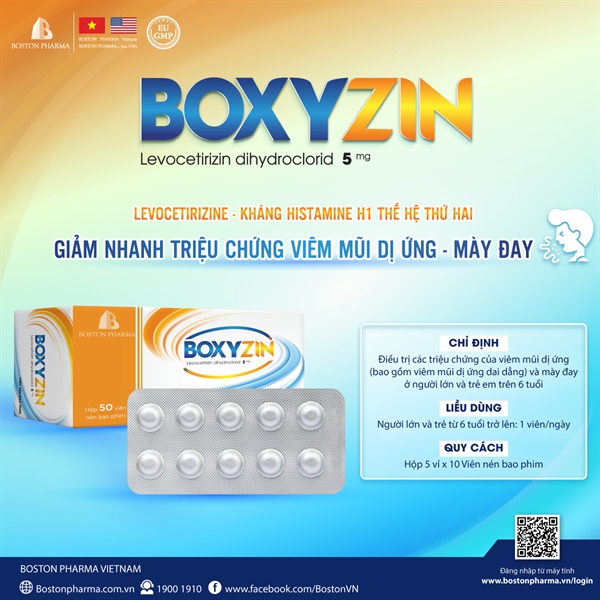 BOXYZIN được chỉ định điều trị các triệu chứng của viêm mũi dị ứng (bao gồm viêm mũi dị ứng dai dẳng) và mày đay ở người lớn và trẻ em trên 6 tuổi.