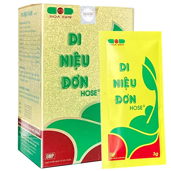 Di Niệu đơn Hose là thực phẩm bảo vệ sức khỏe, thuộc nhóm hỗ trợ thận, được sản xuất tại Công Ty TNHH Dược Phẩm Hoa Sen, Việt Nam. Sản phẩm được bào chế dưới dạng bột, dùng trực tiếp bằng đường uống, thích hợp sử dụng cho người thận kém