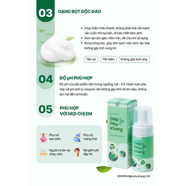 Kết quả thu được đã khẳng định: DUNG DỊCH VỆ SINH PHỤ NỮ DIỆP PHỤ KHANG là chế phẩm AN TOÀN, phù hợp với mọi đối tượng nữ giới. Bao gồm cả phụ nữ sau sinh, phụ nữ mang thai, nữ giới có làn da nhạy cảm. – 99,72% đánh giá dung dịch vệ sinh phụ nữ Diệp Phụ Khang dễ rửa sạch, không nhờn, không nhớt; giúp vùng kín khô thoáng, mềm mại, sạch sẽ ngay sau khi sử dụng. – 100% công nhận độ lành tính, không gây kích ứng, không tác dụng phụ, mùi hương dễ chịu, dạng bọt dễ dùng. Tất cả chị em phụ nữ hiện đại đều sẵn sàng dùng hàng ngày để vệ sinh, chăm sóc vùng kín và giới thiệu cho bạn bè cùng trải nghiệm. |