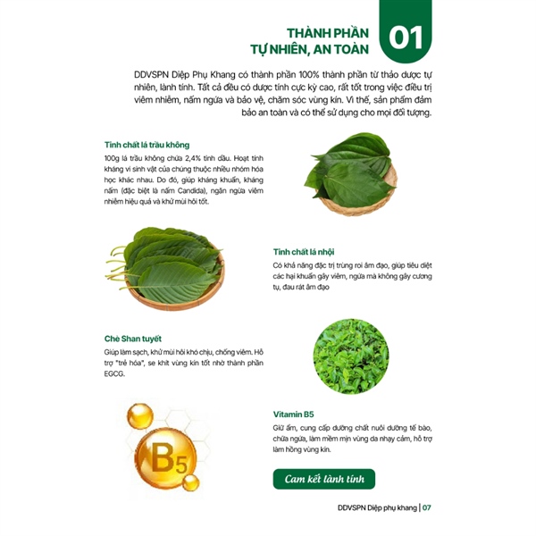 Với thành phần hoàn toàn là thảo dược đặc trị, có dược tính kháng sinh thực vật cao, chiết xuất từ tinh chất lá Trầu không, chè Shan Tuyết, lá cây Nhội,… dung dịch vệ sinh Diệp Phụ Khang có khả năng làm sạch vùng kín, kháng viêm, loại bỏ/ ức chế vi khuẩn vô cùng tốt.