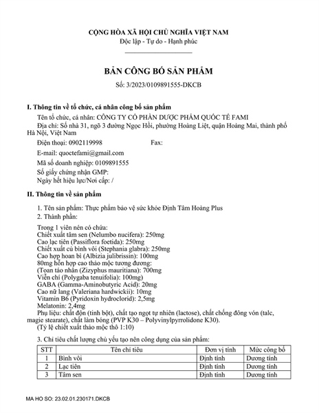 ĐỊNH TÂM HOÀNG PLUS | Hỗ Trợ Cho Người Mất Ngủ, Giúp Tĩnh Tâm, An Thần, Ngủ Ngon Sâu Giấc | (Dược Fami) - Viên