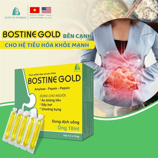 BOSTINE GOLD bổ sung các enzym tiêu hóa như: Amylase, Papain, Pesin, có tác dụng hỗ trợ điều trị chướng bụng, đầy hơi, khó tiêu. Sản phẩm bào chế dạng dung dịch có hương vị trái cây rất thơm ngon dễ uống. Giảm nhanh các triệu chứng chướng bụng, đầy hơi, khó tiêu chỉ sau 15 - 30 phút. Sử dụng hàng ngày giúp cải thiện chức năng tiêu hóa, tăng cường sức đề kháng cho cơ thể.