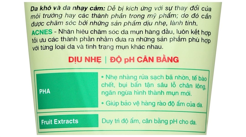 Da khô và nhạy cảm rất dễ bị tổn thương bởi các yếu tố môi trường hoặc các thành phần trong mỹ phẩm. Chính vì vậy, việc lựa chọn các sản phẩm chăm sóc da nhẹ nhàng, lành tính và không gây kích ứng là vô cùng quan trọng. Hiểu được nhu cầu đó, Acnes đã nghiên cứu và phát triển Gel rửa mặt Acnes Gentle Wash, một giải pháp hoàn hảo giúp làm sạch sâu mà vẫn giữ được độ ẩm tự nhiên cho làn da khô và nhạy cảm, đồng thời hỗ trợ ngăn ngừa mụn hiệu quả.