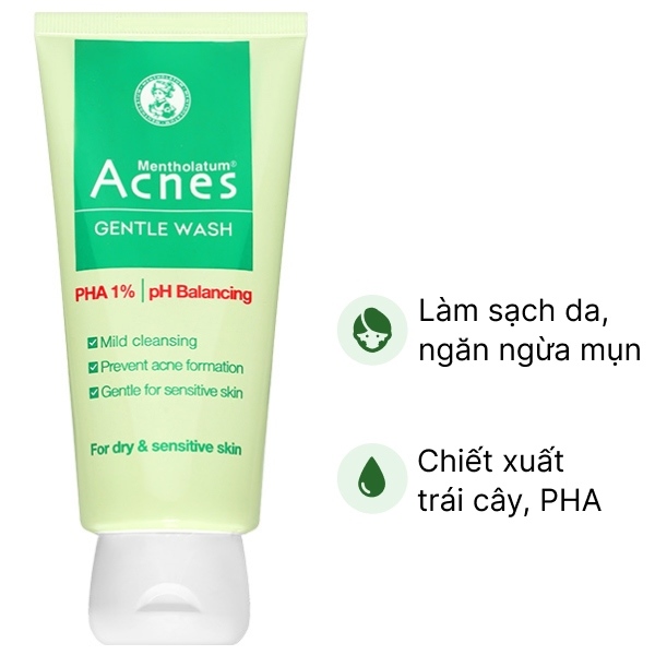 Sản phẩm có kết cấu gel trong suốt, dễ dàng tạo bọt và mang đến cảm giác dễ chịu khi sử dụng. Một trong những điểm nổi bật của Acnes Gentle Wash chính là công thức chứa PHA 1%, một loại axit polyhydroxy mang đến khả năng làm sạch nhẹ nhàng mà không gây kích ứng. PHA giúp loại bỏ tế bào chết, bã nhờn dư thừa và bụi bẩn từ sâu trong lỗ chân lông, ngăn ngừa mụn mới hình thành đồng thời hỗ trợ tái tạo và phục hồi hàng rào bảo vệ da, mang lại làn da khỏe mạnh và sáng mịn.