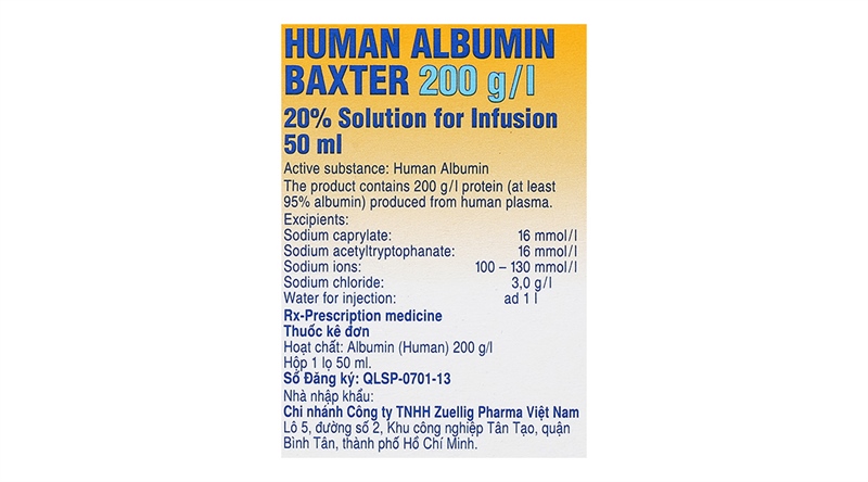HUMAN ALBUMIN BAXTER 200g/l |Dung Dịch Tiêm Phục Hồi & Duy Trì Thể Tích Máu | (NK Áo) - Chai 50ml