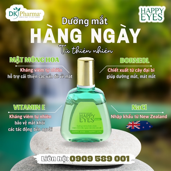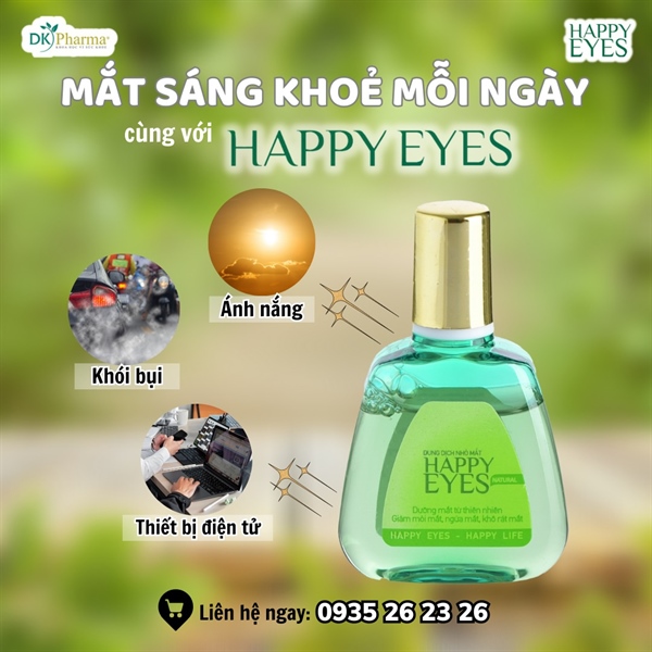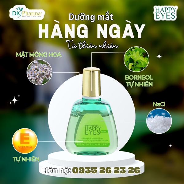 - HAPPY EYES NATURAL là sản phẩm nhỏ mắt thảo dược từ mật mông hoa, vitamin E, borneol tự nhiên và natri clorid dùng rửa mắt để loại các vật lạ như bụi bẩn vào mắt, loại các tế bào chết của tuyến nước mắt, làm sạch ghèn (rỉ) mắt.