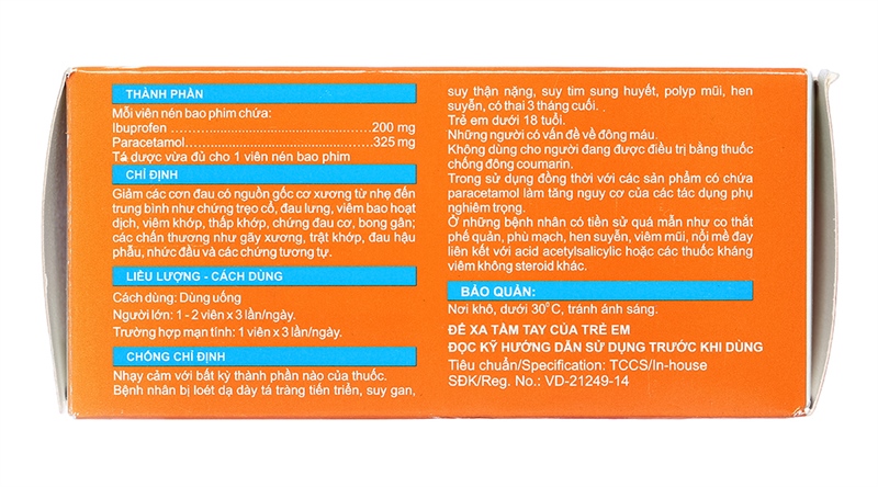 - Hoạt chất chính: Paracetamol (hàm lượng 325mg) và Ibuprofen (hàm lượng 200mg).