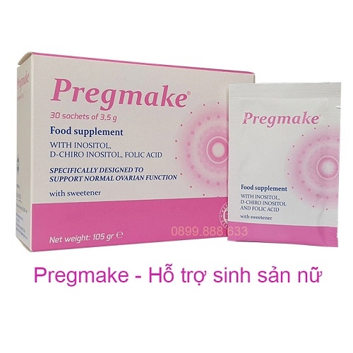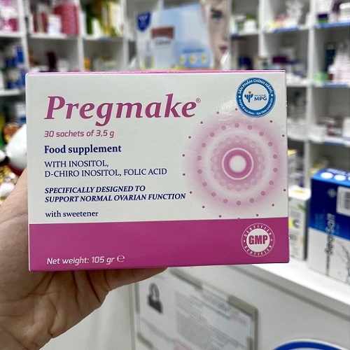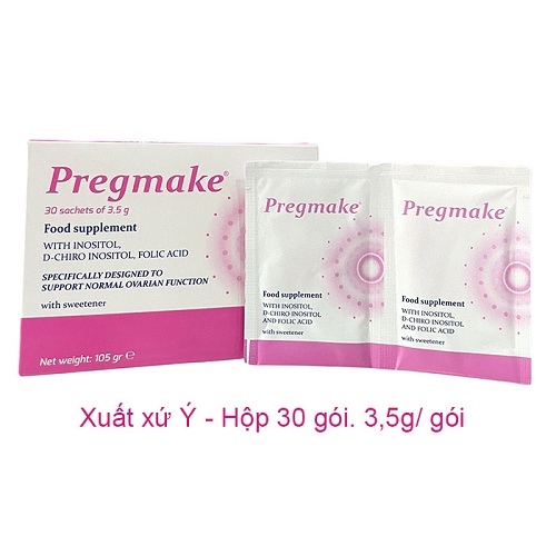 Pregmake là sản phẩm hỗ trợ sinh sản của Ý, với công thức là sự kết hợp giữa Myo-inositol và D-Chiro-inositol cùng nhiều thành phần dưỡng chất khác giúp cải thiện chức năng buồng trứng và hỗ trợ khả năng sinh sản ở phụ nữ. Sản phẩm được Cục an toàn thực phẩm – Bộ Y Tế cấp số đăng ký ngày 01/10/2020 và được sử dụng rộng rãi trên toàn quốc.