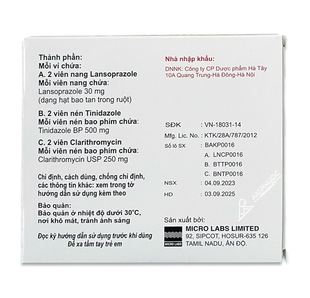 Mỗi lần uống 3 viên trong đó có: 1 viên nang lansoprazole, 1 viên nén clarithromycin và 1 vién nén tinidazole.