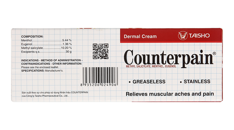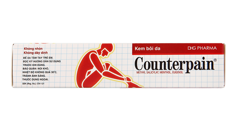 Mọi thông tin dưới đây đã được Dược sĩ biên soạn lại. Tuy nhiên, nội dung hoàn toàn giữ nguyên dựa trên tờ Hướng dẫn sử dụng, chỉ thay đổi về mặt hình thức.1. Thành phầnThành phần CounterpainHoạt chất: Menthol 5,44%, Eugenol 1,36%, Methyl salicylat 10,20%.Thành phần tá dược: Natri lauryl sulfat, carbopol 934, glyceryl monostearat, cithrol S20BW, nhũ tương simethicon, natri hydroxyd, nước tinh khiết.2. Công dụng (Chỉ định)Giảm đau trong các trường hợp: Đau cơ, đau do bệnh thấp khớp, bong gân.3. Cách dùng - Liều dùngĐường dùng: Dùng tại chỗ.Bôi 3 - 4 lần mỗi ngày vào các vùng bị bệnh và xoa nhẹ nhàng.Hoặc theo chỉ dẫn của Thầy thuốc.- Quá liềuKhông có nguy cơ về quá liều. Trong trường hợp vô ý uống nhầm, làm trống dạ dày bằng cách hút dịch và rửa dạ dày. Điều trị triệu chứng và điều trị hỗ trợ thêm.4. Chống chỉ địnhTrẻ em < 6 tuổi, trẻ em có tiền sử động kinh hoặc co giật do sốt cao.Quá mẫn với các thành phần của thuốc.Không bôi lên vùng da bị nhiễm trùng hoặc bị tổn thương.5. Tác dụng phụThuốc được dung nạp tốt. Có thể gặp ngứa, đỏ hoặc nổi ban da.Thông báo cho bác sĩ những tác dụng không mong muốn gặp phải khi sử dụng thuốc.6. Lưu ý- Thận trọng khi sử dụngThuốc chỉ dùng ngoài.Chỉ bôi thuốc vào vùng da lành, không được bôi vào các vết thương ở da hoặc vết thương hở. Không để thuốc tiếp xúc với mắt hoặc niêm mạc.Không được dùng đường uống.Liên quan đến tá dược Natri lauryl sulfat:Natri lauryl sulfat có thể gây các phản ứng tại chỗ (cảm giác đau nhức, nóng rát da) hoặc làm tăng tình trạng kích ứng da gây ra bởi các sản phẩm khác khi bôi lên cùng vị trí trên cơ thể. Bệnh nhân bị suy giảm lớp chắn bảo vệ da (như trong trường hợp viêm da dị ứng) sẽ nhạy cảm hơn với các kích ứng này.- Thai kỳ và cho con búNói chung thuốc được xem là an toàn. Nên dùng thuốc theo hướng dẫn.- Khả năng lái xe và vận hành máy mócThuốc không ảnh hưởng lên khả năng lái xe và vận hành máy móc.- Tương tác thuốcChưa có báo cáo về tương tác thuốc.7. Thông tin thêm- Đặc điểmMô tả sản phẩm:Kem màu trắng đến gần trắng, mềm, mịn, có mùi mạnh của methyl salicylat, đồng nhất, không bị tách lớp, không có tạp nhìn thấy được.- Bảo quảnNơi khô, nhiệt độ không quá 30 độ C, tránh ánh sáng.- Hạn dùng36 tháng kể từ ngày sản xuất.- Thương hiệuDược Hậu Giang.