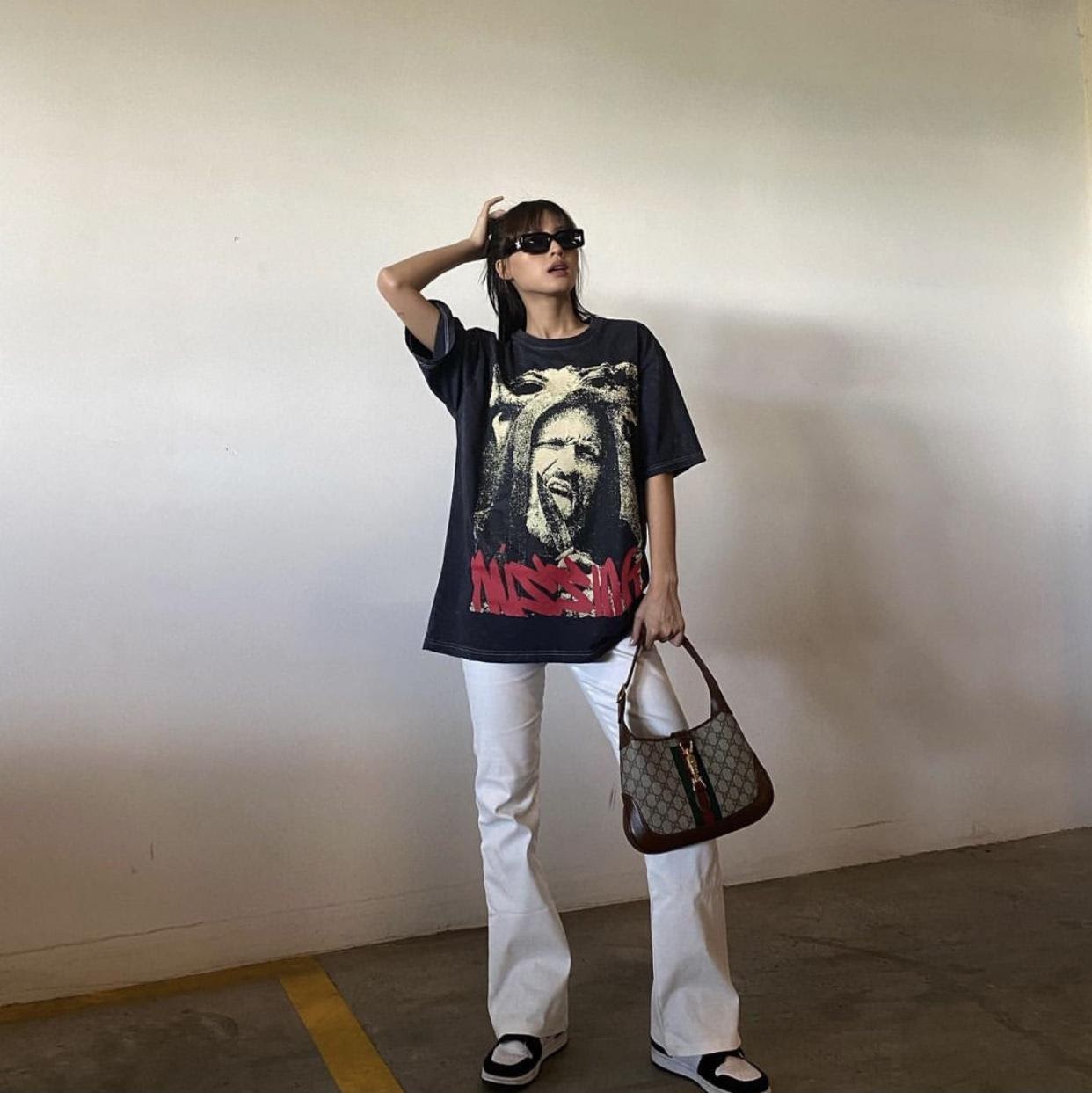 Cũng là kính râm, giày Nike cùng áo phông nhưng @j.nlee đã biến tấu outfit của mình bằng cách diện quần ống loe trắng. Đi kèm set đồ là chiếc túi đến từ nhà mốt Gucci. Tất cả đã khiến cô bạn chất lừ chẳng thua kém bất cứ fashionista nào!
