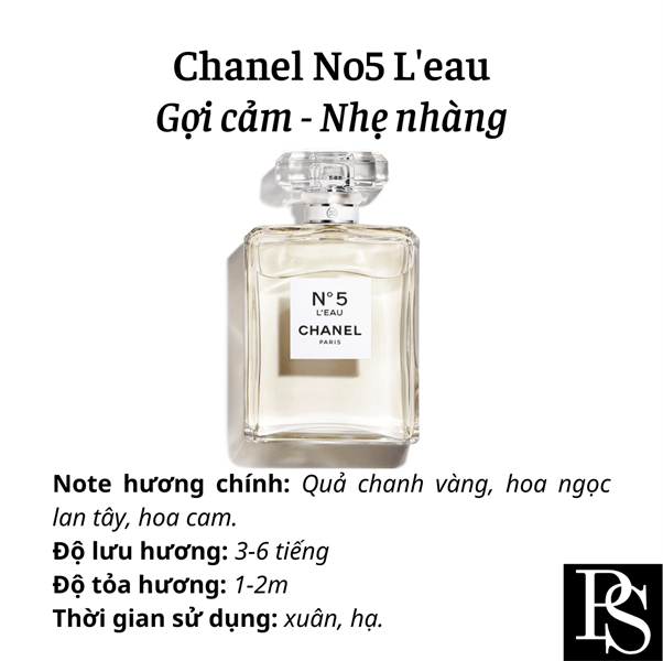 No5 L’eau được hãng khuyến cáo dùng tốt nhất vào thời điểm ban ngày, mùa thu, mùa đông. Sản phẩm dành cho những cô gái trên 25 tuổi.