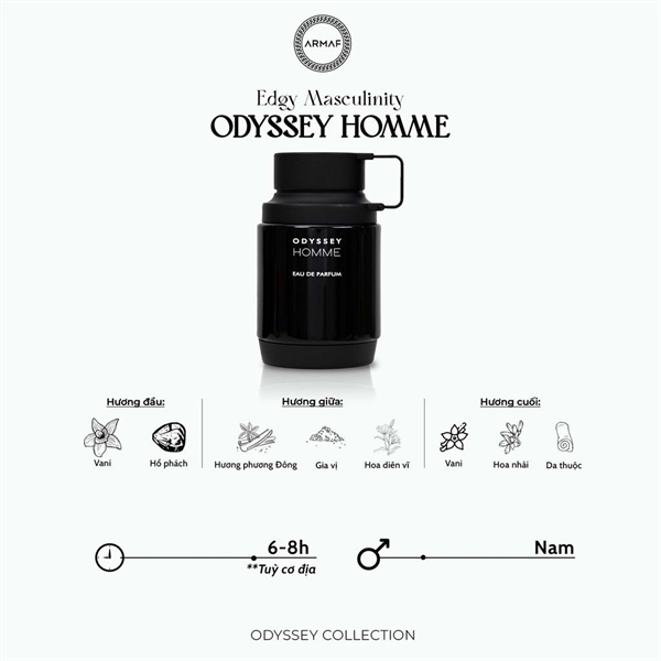 Tập trung lột tả vẻ đẹp bí ẩn và đầy quyến rũ của bóng tối - Odyssey Homme được "đo ni đóng giày" cho chàng trai biết cách tận hưởng cuộc đời như một nghệ sĩ. Mở đầu từ tốn với sự ngọt ngào, ấm áp của vani và hổ phách, Odyssey Homme nhanh chóng đưa dẫn người yêu hương đến với mùi vị mạnh mẽ của các loại gia vị và các nốt hương phương Đông, kết hợp thuốc lá và hoa diên vỹ lôi cuốn đầy mị hoặc. Chưa dừng lại đó, với lớp nền vani hòa quyện mùi da thuộc nam tính và hoa nhài, Odyssey Homme tạo nên một sắc thái hấp dẫn và lưu luyến. Nếu là một cho chàng trai sành điệu, cá tính nhưng cũng không kém phần trầm ổn, bí ẩn, tại sao bạn không "phiêu" cùng Odyssey Homme?