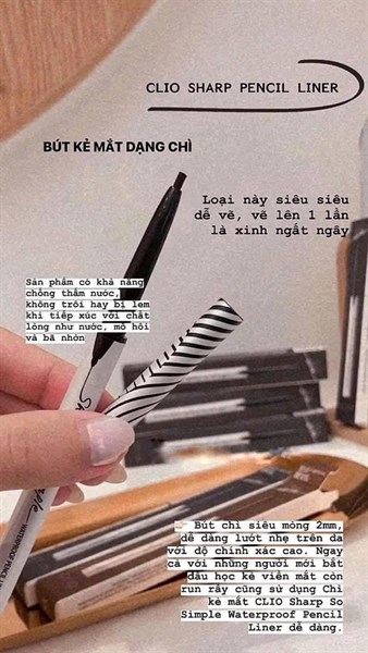 👉🏻 Bút chì siêu mỏng 2mm, dễ dàng lướt nhẹ trên da với độ chính xác cao. Ngay cả với những người mới bắt đầu học kẻ viền mắt còn run rẩy cũng sử dụng Chì kẻ mắt CLIO Sharp So Simple Waterproof Pencil Liner dễ dàng.