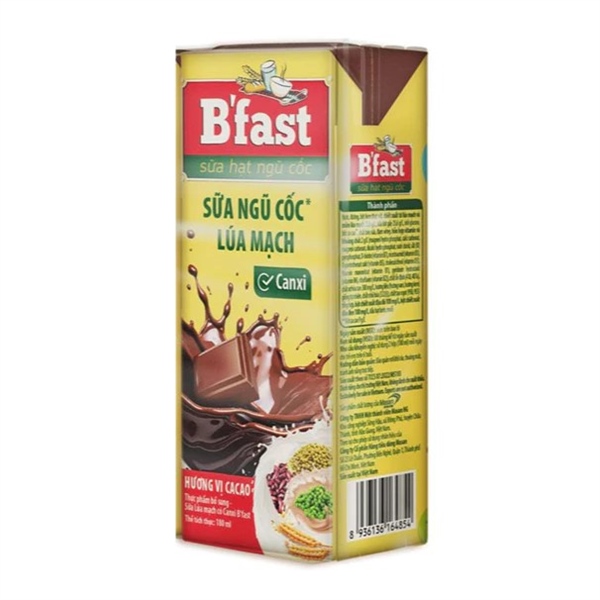 B'fast Sữa ngũ cốc lúa mạch canxi vị cacao 12x4x180ml - hộp