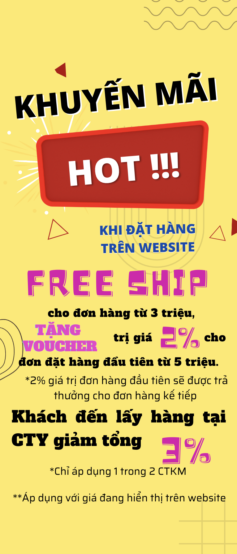 - Free Ship đơn hàng >3 triệu, khuyến mãi Voucher trị giá 2% đơn đặt hàng đầu tiên từ 5 triệu (Voucher 2% giá trị đơn hàng đầu tiên được trả cho đơn hàng kế tiếp)