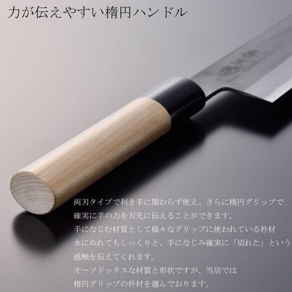 Thép trắng YasukiHagane số 2. Phần đầu cán ghép với lưỡi dao làm từ sừng trâu. Cán gỗ Magnolia obovata